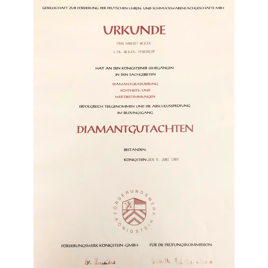 Die Gründerin Harriet Weiler ist zertifizierte Diamantgutachterin und bringt jahrzehntelange Erfahrung in der Diamantgradierung, Echtheits- und Wertbestimmung mit. Du kannst darauf vertrauen, dass jeder Geschenkdiamant ein echtes Meisterstück aus erfahrenen Händen ist – einzigartig, wertvoll und perfekt für deine besonderen Momente.