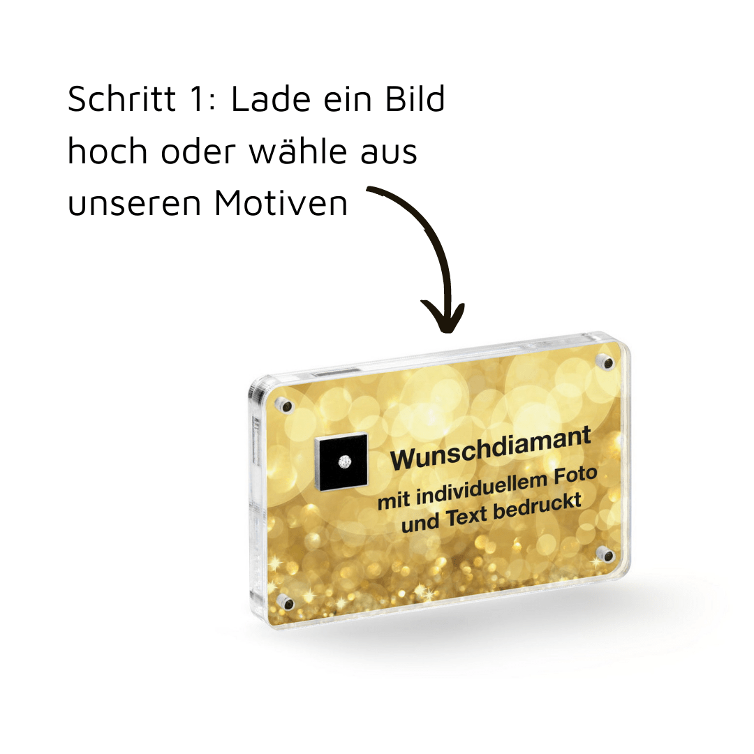 Du kannst deinen Geschenkdiamanten mit einer individuellen Botschaft gestalten – etwa einem Bild, Namen oder einem besonderen Datum. Darüber hinaus bieten wir eine Vielzahl von Motiven, passend zu jedem Anlass, wie Herzen, Ringe oder inspirierende Schriftzüge. Klicke einfach auf JETZT GESTALTEN, um zu Konfigurator zu gelangen.